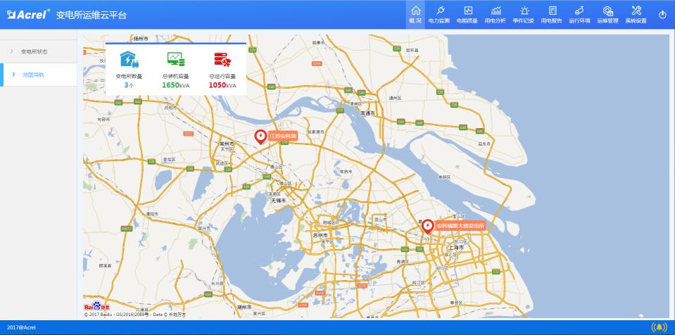 結(jié)合電子地圖顯示變電所的分布情況,并匯總變電所數(shù)量、累計裝機容量、累計運行容量等信息,提供查看對應(yīng)變電所詳細信息的入口。