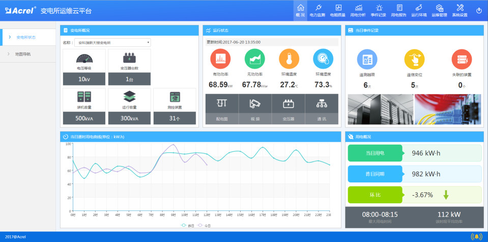顯示所關(guān)注變電所的基本信息(電壓等級、變壓器臺數(shù)、裝機容量、運行容量)、運行狀態(tài)(功率、環(huán)境溫濕度等)、事件信息(遙信事件、遙測事件)、當(dāng)日用能情況(逐時用能趨勢、環(huán)比用能情況)。