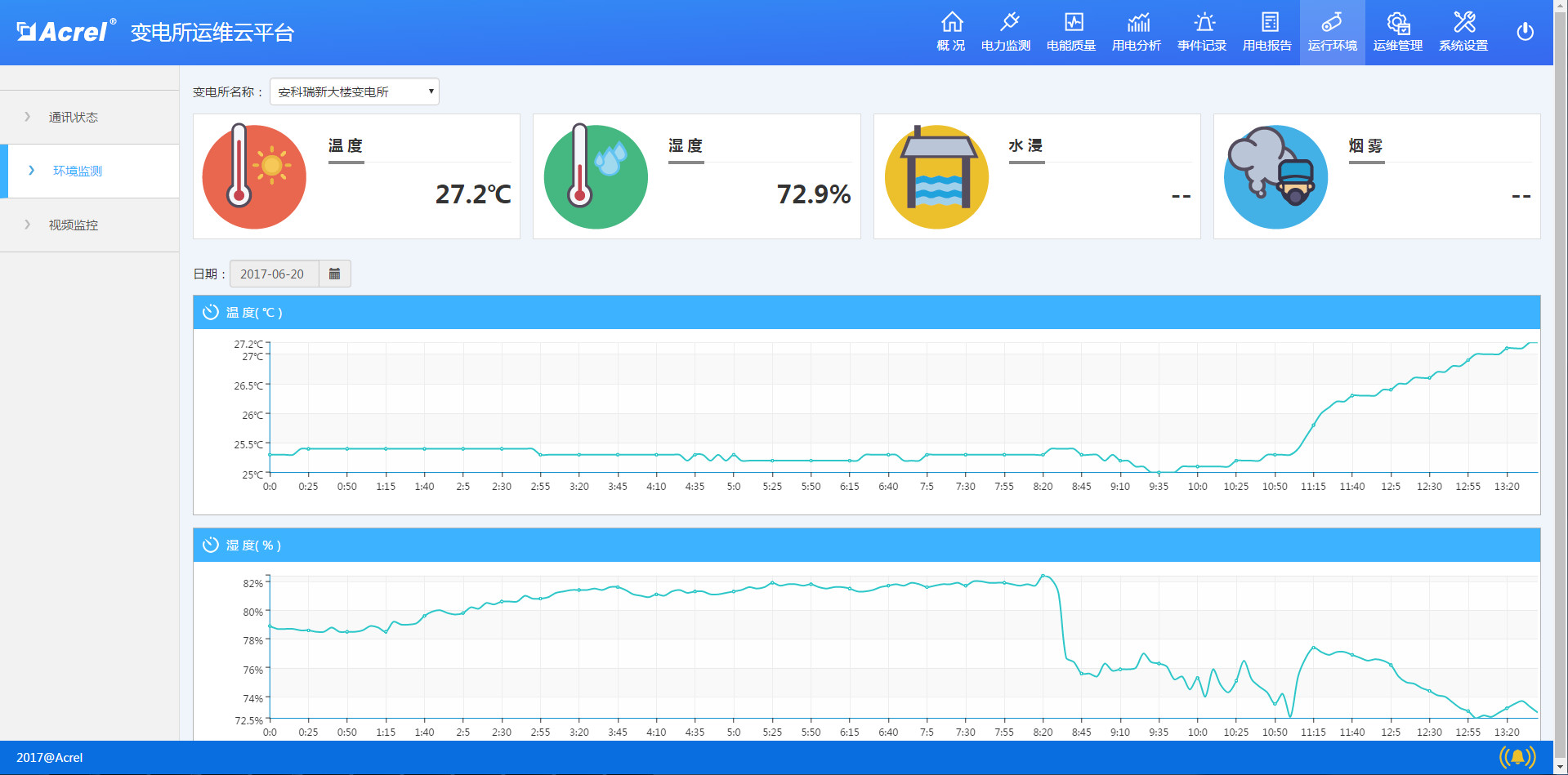 顯示某個變電所的儀表通訊狀態(tài)、環(huán)境信息(溫度、濕度、水浸、煙霧等)、視頻信息等。