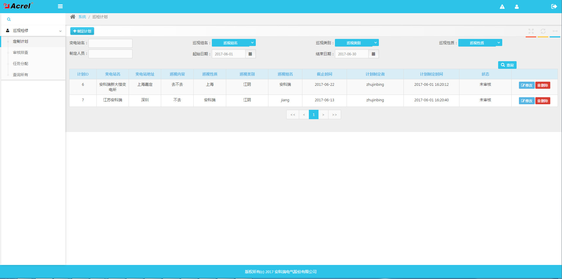 提供巡檢計劃編制,經(jīng)審核后生成巡檢任務(wù)推送到巡檢人員的手機上,巡檢人員執(zhí)行巡檢任務(wù)并登記巡檢內(nèi)容;平臺可提供數(shù)據(jù),供運維參考,為巡檢提供便利。