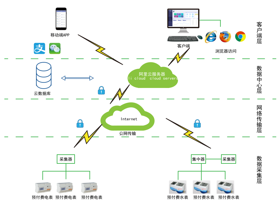 對于分布不同省、地市或同地市不同區(qū)域的連鎖商業(yè)、集團、百貨、門店、物業(yè)、院校等業(yè)務分散,要求集中管理、線上支付,低額提醒、欠費告警。但常規(guī)的本地插卡付費、本地預付費并不能完全滿足客戶管理需求,預付費云平臺應運而生。AcrelCloud-3200水電預付費云平臺無縫集成商業(yè)、物業(yè)公司、集團企業(yè)、院校等分散布置的安科瑞DDSY/ADF系列電子式預付費電能表、閥控智能水表等,提供微信、支付寶、銀聯(lián)等可選的在線支付方式,大大方便了用戶充值、圈存,提供預警和充值、退費、電能消耗等記錄查詢,方便用戶和管理方的數(shù)據(jù)統(tǒng)計和財務分析,提供先交費后使用的管控機制,大大降低了管理部門的收費成本。應用場所: