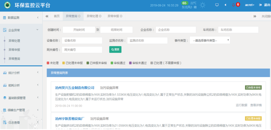 通過關(guān)聯(lián)分析、超限分析、啟停時(shí)間分析,及時(shí)發(fā)現(xiàn)環(huán)保治理設(shè)備未開啟、異常關(guān)閉及減速、空轉(zhuǎn)、降頻等異常情況,同時(shí)通過數(shù)據(jù)分析還可以實(shí)時(shí)監(jiān)控限產(chǎn)和停產(chǎn)整治企業(yè)運(yùn)行狀態(tài),如圖所示: